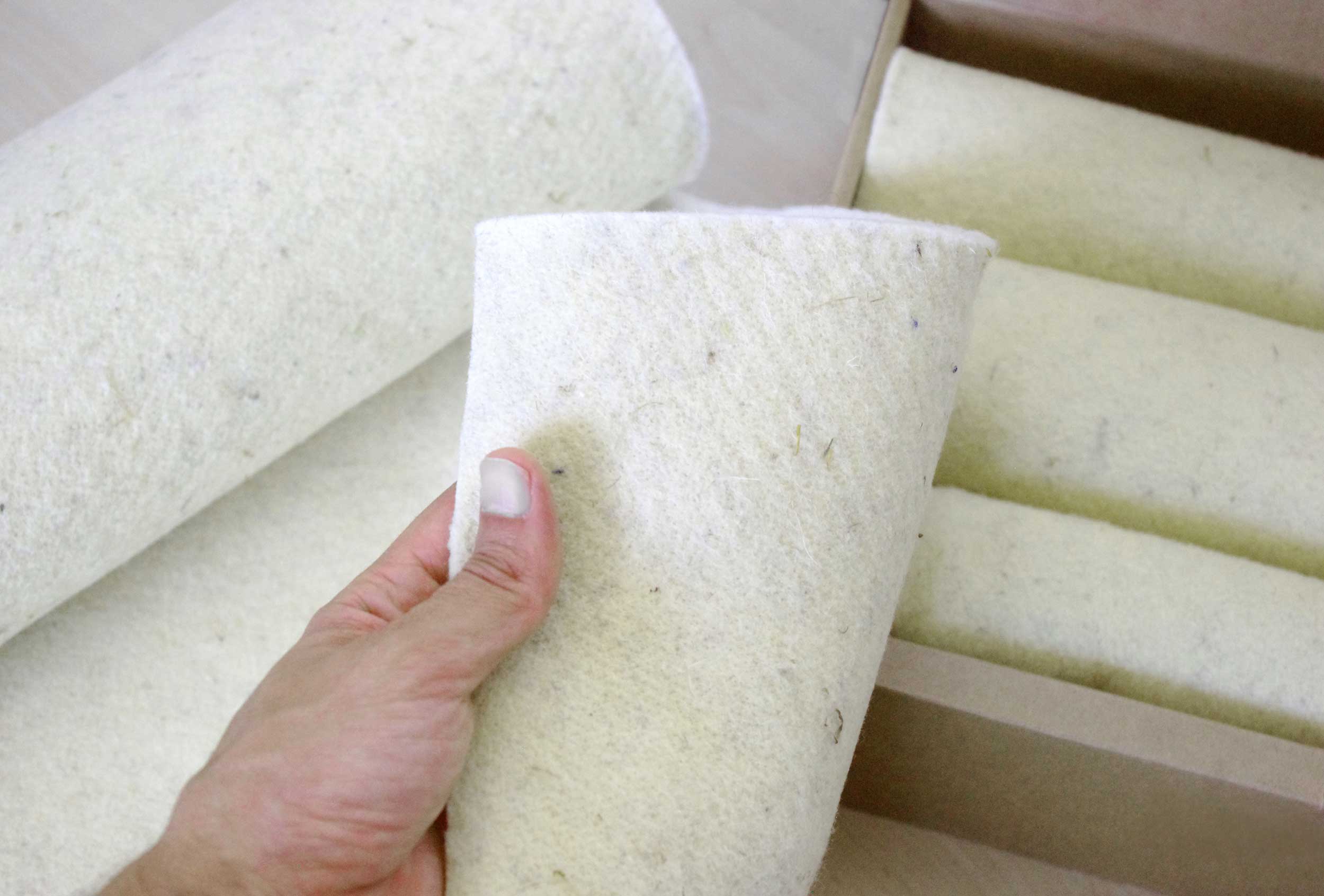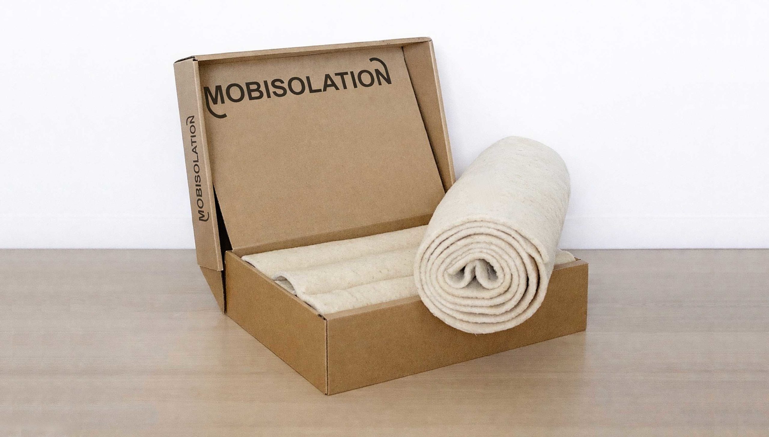 Mobisolation utilise du feutre de laine, fabriqué par la Filature Colbert à Camarès, dans l’Aveyron, en France. La laine présente des qualités thermiques intéressantes ainsi qu’une bonne résistance au feu. Le choix de ce matériau est aussi motivé par le souhait de valoriser ce co-produit de l’élevage brebis de race Lacaune typique de l’Aveyron.