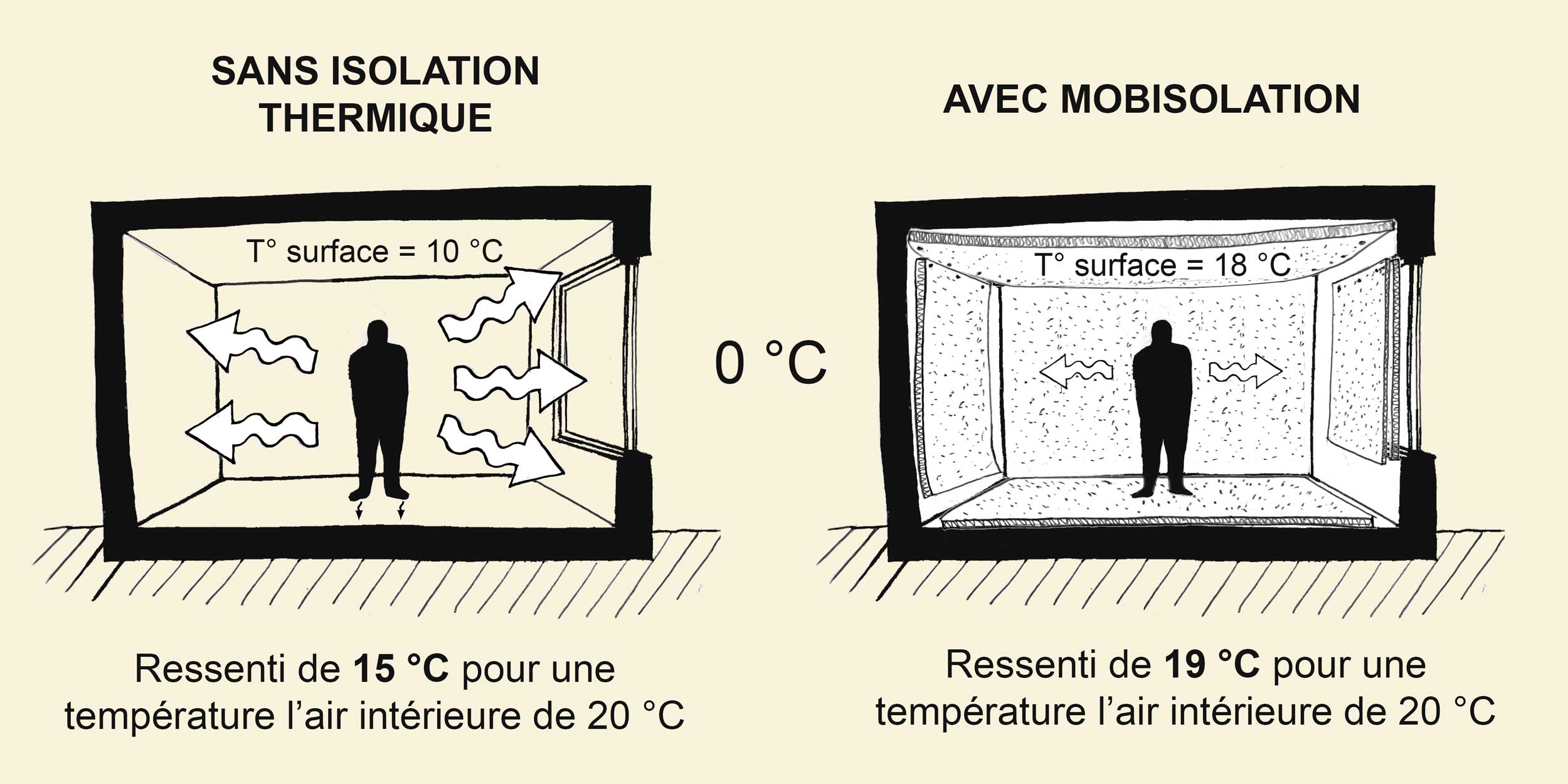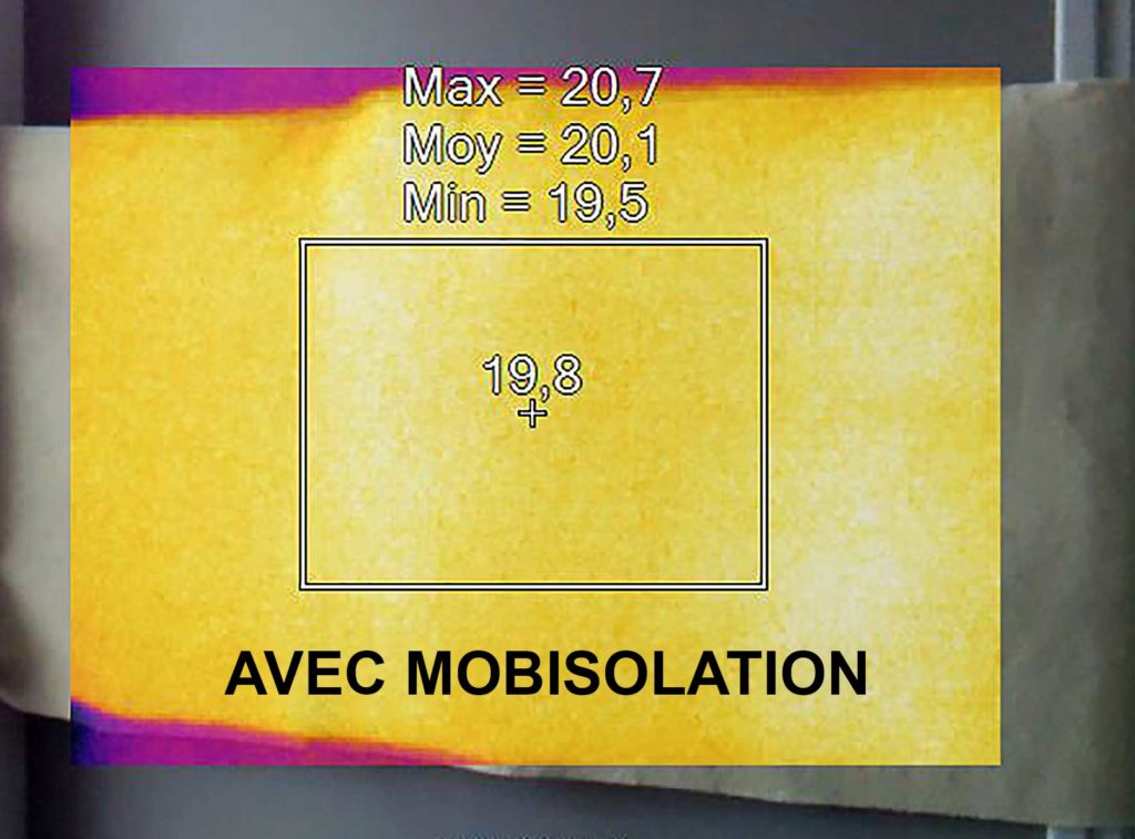 Mobisolation agit sur ce levier. L’isolation mobile apporte en effet une correction thermique qui limite l’effet de paroi froide ressenti à proximité d’un vitrage ou d’un mur mal isolé. Mobisolation contribue à améliorer le confort thermique intérieur malgré la finesse du feutre de laine (environ 7 mm) qui limite sa résistance thermique (R = 0,6).